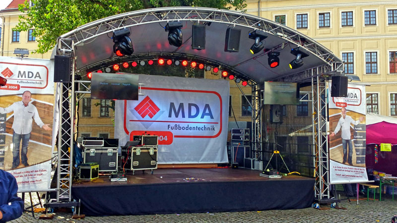 Bis 25 KW mit 6 Stück Scanner PSC 575, 4 Stück Moving Head Wash 575, 8 Stück LED- Wash, 12 LED Balken, 5 Stück LED Bar, 2 Stück LED Fluter je 18x8 W, Nebelmaschine Hazer, Laser 1000mw RGB und 2x 250mw RGY