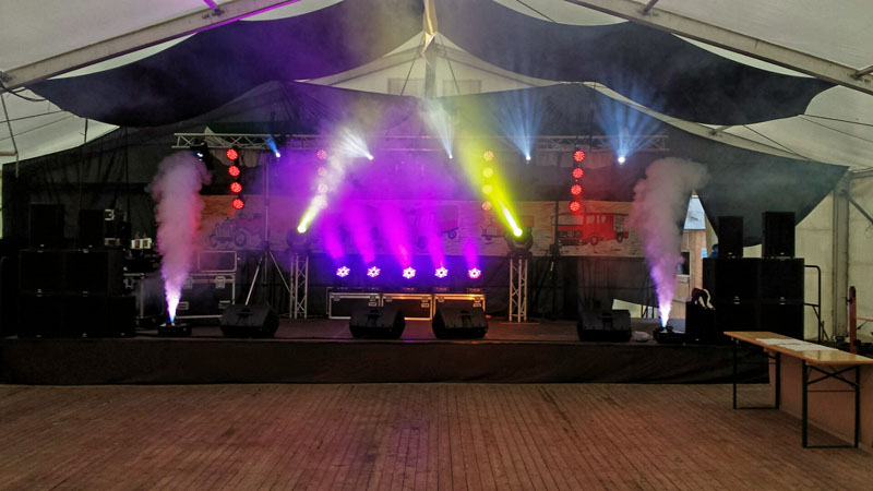 Bis 25 KW mit 6 Stück Scanner PSC 575, 4 Stück Moving Head Wash 575, 8 Stück LED- Wash, 12 LED Balken, 5 Stück LED Bar, 2 Stück LED Fluter je 18x8 W, Nebelmaschine Hazer, Laser 1000mw RGB und 2x 250mw RGY