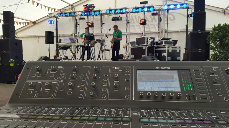 Bis 14 KW mit Bose- Soundsystem und KS- Beschallungstechnik, Monitoring mit 6 Stück Mackie SRM 450, Mikrofone mit 8 Stück Sennheiser ew- Serie, 3 Stück Headset Sennheiser ew- Serie, 1 Stück Shure Beta 58 UHF, 4 Stück AKG 1000, 10 Stück Sennheiser e845, 24 Kanal- Mixer, 32 Kanal-Digital-Mixer Midas M32